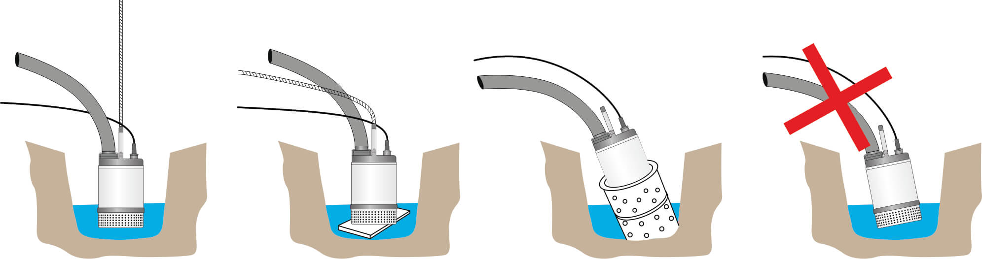 Najpomembneje je preprečiti, da bi se črpalka zakopala v tla, kar je še posebej pogosto na mestih s peščeno ali ilovnato prstjo. To lahko dosežete tako, da črpalko obesite nad dno ohišja z vrvjo/verigo v primeru globinske uporabe ali pa jo namestite na neke vrste podlago (npr. lesena deska ali grobi gramoz) v primeru črpanja iz odprtega zbiralnika.