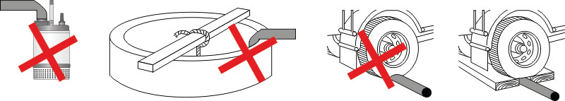 Vedno morate preprečiti ostre zavoje in pregibe izpustne cevi. Če se cev močno upogne, se zmanjša njena največja pretočna zmogljivost, kar ustvari dodatne izgube zaradi trenja in zmanjša učinkovitost pretoka črpalke.